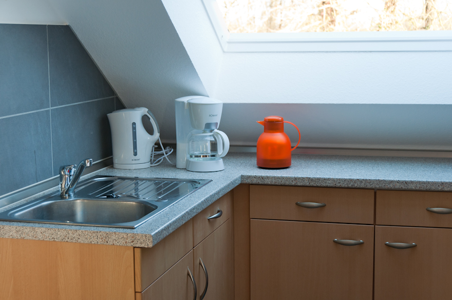 Die Küche ist vollständig eingerichtet. Dazu gehören selbstverständlich ein Herd, Backofen, Kühlschrank, Kaffeemaschine, Toaster, Wasserkocher, etc.